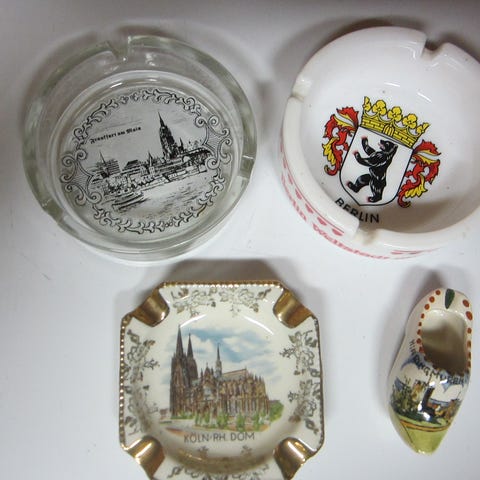 Reklame, askebæger. Bedårende danserinde i flotte farver reklamerer for Nielsen Lakering, Hvidovre.