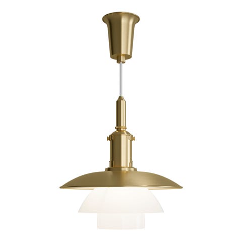 Overskærm i messing og underskærme i mundblæst opalglas.