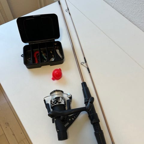 Fiskesæt, fra Biltema. 6,6 fods kulfiberstang, kastevægt 5-25 gram, Desuden kulfiberhjul med påspolet nylonline. Meget velholdt. Perfekt til barnet, der skal prøve at fiske. Sendes ikke - skal afhentes i Hjørring.