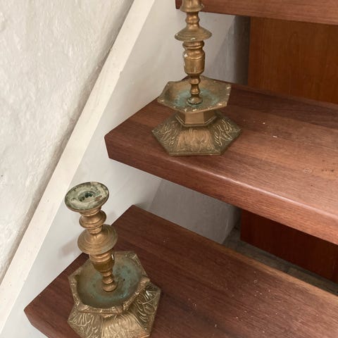 Lysestager, Glas, messing, 120 år gl., Et par stager af glas og messing. Dekoreret med vinranker.