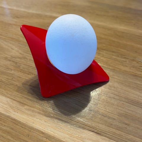Æske m. 4 æggebægre, mrk BIRDY, design Morten Riis, fremstillet i fødevaregodkendt pink plast, tåler maskinopvask. Den organiske form sikrer, at ægget altid står stabilt & sikkert. Aldrig været i brug (fejlkøb).