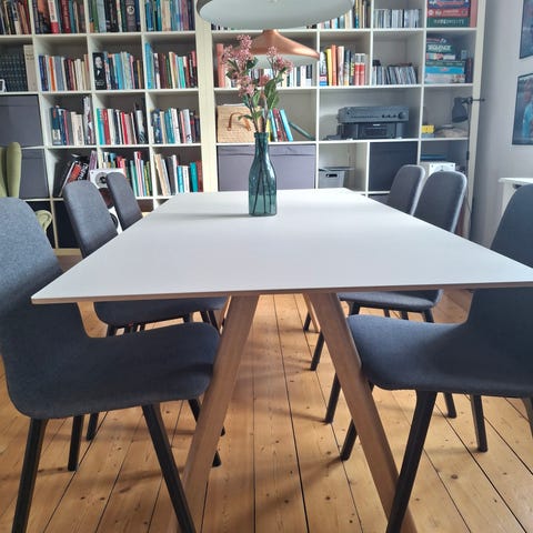 Hvid bordplade med to tillægsplader og bordben fra hay