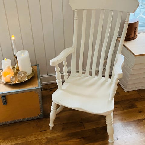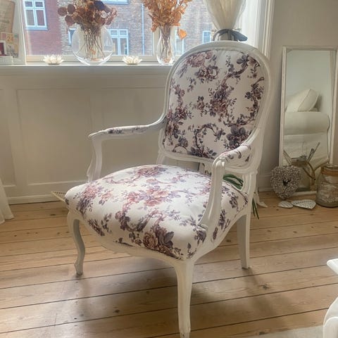 NEDSAT !! OBS PRIS.Meget smuk unik fransk stol med fodskammel/bord, begge dele med smukt blåt og hvidt mønstret betræk