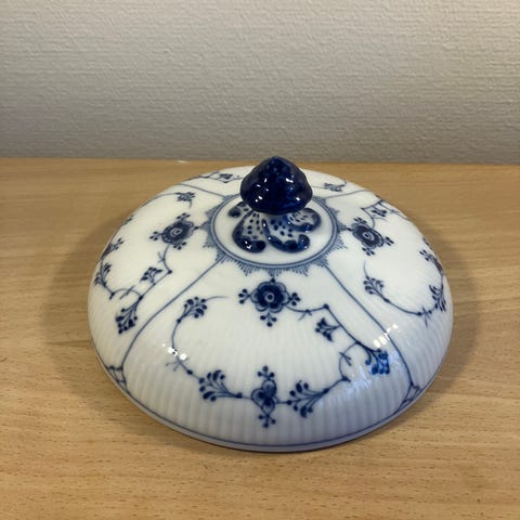 Smukt gammelt terrinlåg 595. 1. sortering, med to kanthak, men ingen revner. Fungerer upåklageligt. Afhentning Frederiksberg C