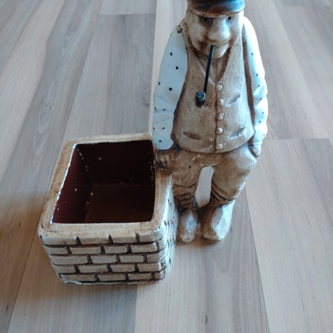 Super fint granat hylster, lavet om til sparebøsse, fod lavet, på loddet navneskilt(Oliver) der kan varmes af igen, nøgle bortkommet, monteret med projektil diameter 50 mm højde inklusive projektil 400 mm. vejer 2.5 kilo