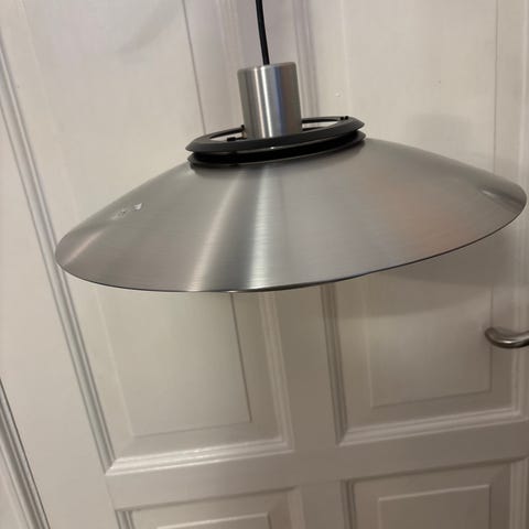 2 fikse lamper fra danske JEKA. Minder meget om den klassiske Focus. Farven er lys karrygul. Kan let omlakeres da skærmen hænger løst på ledningen - sidste billede. Med 2x130 cm ledning og fatning til elpære med stor sokkel/E27. Diameter på skærm er 15,8 cm. Prisen er for begge lamper.
