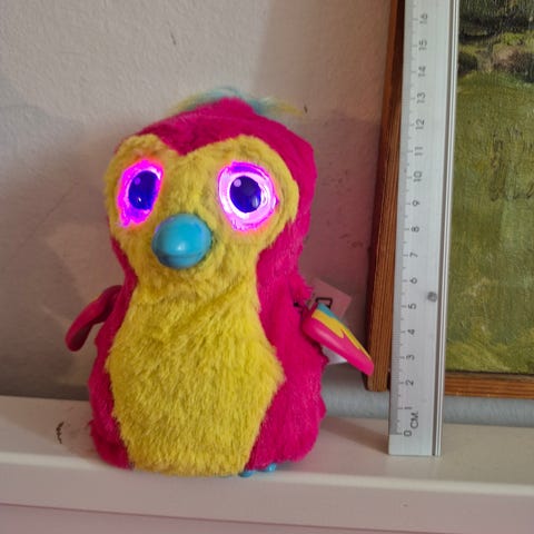 Det ene øje lyser desværre ikke længere, men det andet lyser, skifter farve og den snakker og bevæger næbbet.