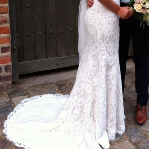Brudekjole i blonder. Virkelig smuk, kun brugt en gang. Renset. Inkl bælte og BH. Købt i Nicolaj Kjoler for kr 18.000. Bruden var 166 cm høj og sko 7 cm. Skal prøves.