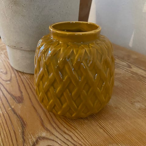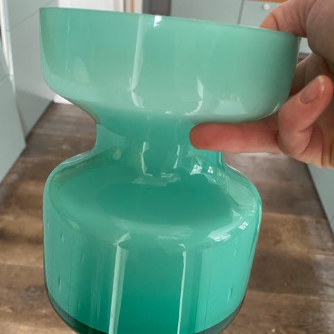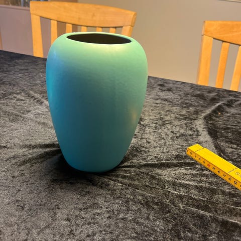 Stor turkisfarvet vase ca 35 cm høj, Smuk, rund turkisfarvet vase med sort lak indeni.