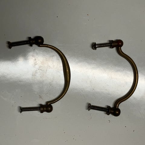 Beslag messing. Højde 4,5 cm. Bredde 2,4 cm. 90 stk haves. Sælges stykvis