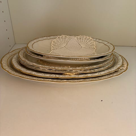 Flot spisestel bestående af 11 middagstallerkener, 12 dybe tallerkener, 12 desserttallerkener, 1 sauceskåle, 2 kartoffelskåle, 4 fade i forskellige størrelser.