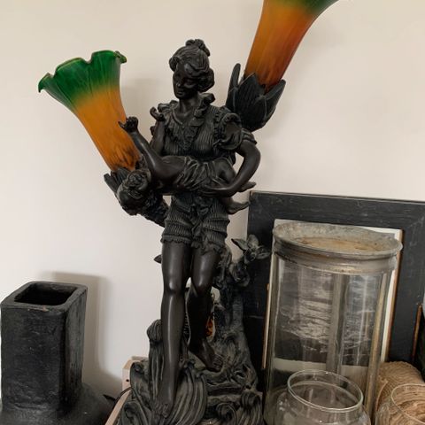Antik art nouveau skulpturel bordlampe af ung kvinde i blæsevejr