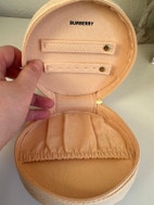 Smykkepung opbevaring af smykker. Ø: 13 cm. Bredde 4,4 cm. Elegant rund lille pouch i bomulds canvas. Ubrugt. Kun ligget i skuffe. Lille mærke på bagsiden se foto.
