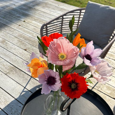Jeg laver disse valmuer i håndfarvet crepepapir på bestilling