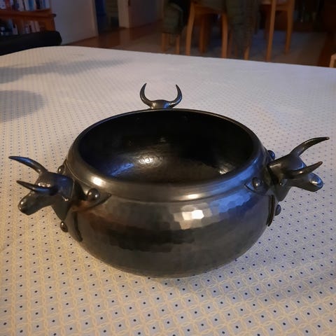 Bowle med låg, Gammel kobberbowle med låg fra omkring 1940.