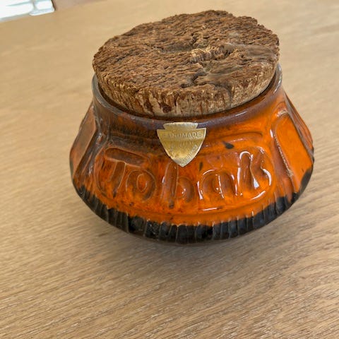 fed gammel Retro keramik beholder m. låg, til tobak fra Ernst Faxe Keramik Denmark. (med original klistermærke)