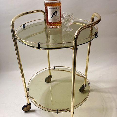 Søgeord: Serveringsvogn, rullebord, rullevogn, guld, messing, vintage, patineret, gammel, antik, barbord.