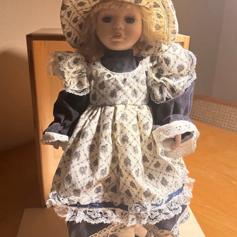 Vintage Porcelain Doll Eskimo Blue Fur Trim Outfit Blonde Blue Eyes Size 8" Tall