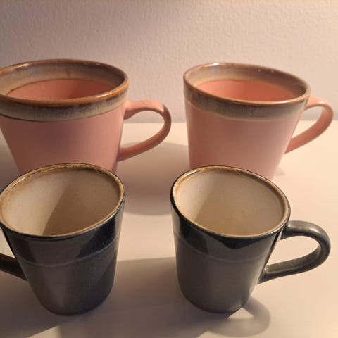 Kopperne er håndglaserede, keramik, tåler opvaskemaskine og mikroovn. Højde 7,5 cm. Indhold 18 cl. Prisen er pr stk.