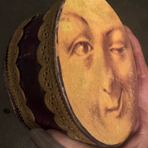 Flot gammel candy container i veloustof, som dog er slidt, og noget bastlignende stof. I kanten er sat en dresden kant, som også er lidt medtaget. Indeni er ægget beklædt m lilla slilkelignde stof.