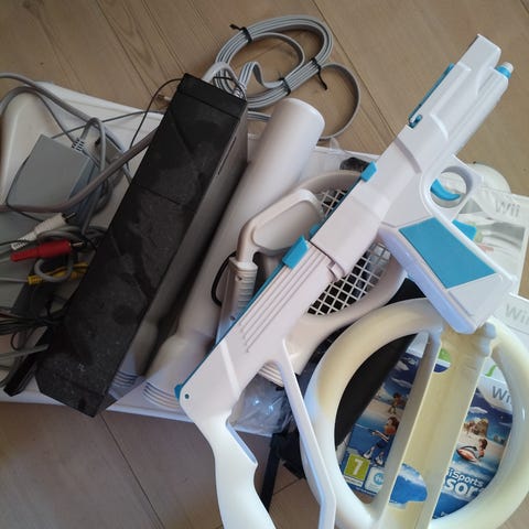 Konsol med 9 spil, 4 controller + rat til bil spil , Wii Fit + Balance board