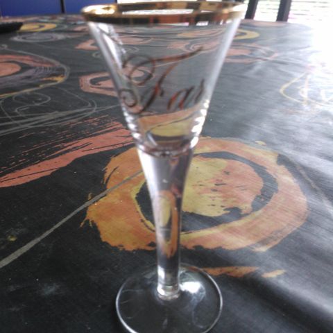 Fint snapseglas , med FAR skrevet i guld farve & guld farvet kant.