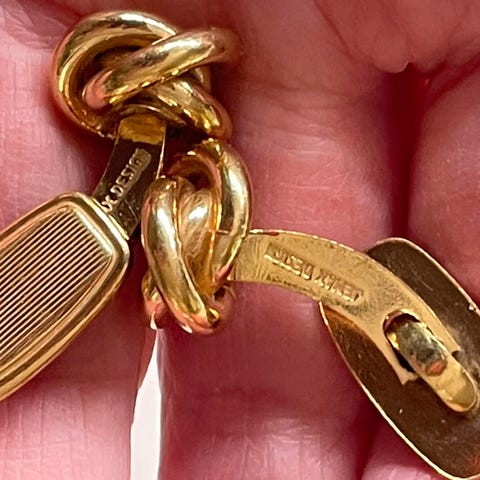 Slipsenål og manchetknapper i forgyldt sølv. Med indgraveret monogram AJP. Nålen er markeret med 9 CT GOLD ON SILVER. Slipsenålen er 6 cm lang. Pladerne måler 116x8 mm.
