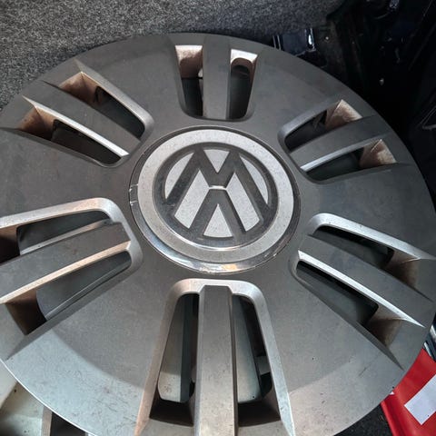 Fine kapsler til VW 15 tommer fælge. Logo i midt er slidte, men kapsler er fine.