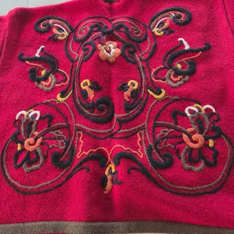 Denne cardigan/ strikjakke er strikket efter Hanne Falkenbergs model Mermaid. Materialet er 100% ren uld. Størrelse M. Jeg vil mene, den kan bruges af både størrelse 38, 40 og 42. Kan evt. lukkes med en broche eller bruges med et bælte om.
