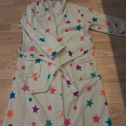 Hejsa jeg sælger den her morgenkåbe som er lyserød med Mørke lilla stjerner og måner på den er en børnestørrelse til en på omkring 7-11 år tror jeg