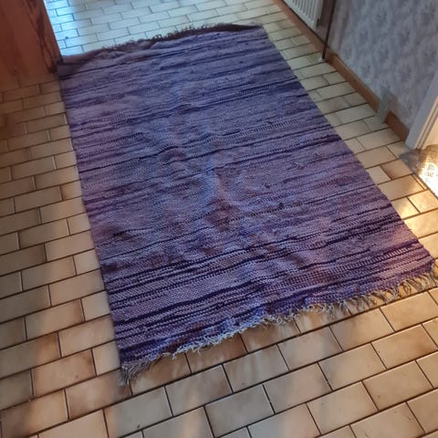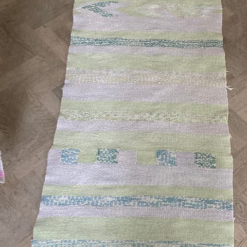 Smukt kludetæppe af bomuld, vævet af Birgitte Hiul i 1970’erne. Grøn-violette farver og mønster med felter og pile, ca. 75 x 270 cm. Kan vaskes i maskine på 40 grader. Nyvasket.