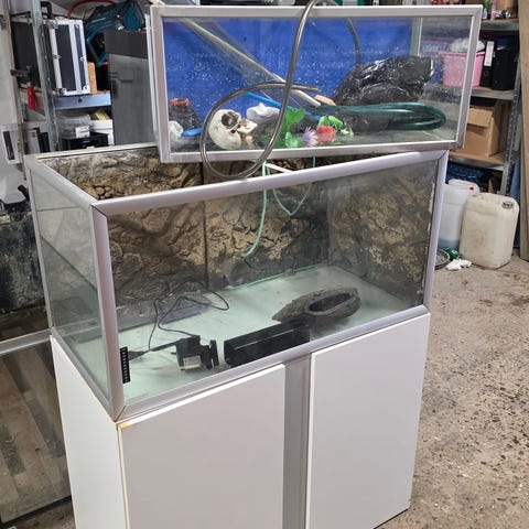 Sælger her med mit 250 liters akvarie, der er alt hvad man skal bruge for at kunne starte et akvarie op. 2 led skinner pump og luft pumpe.