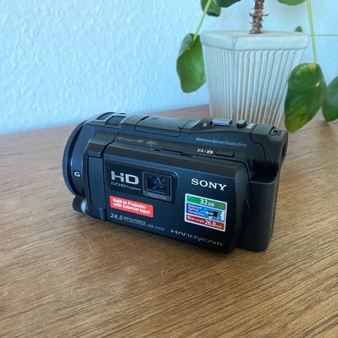 Lille håndholdt video kamera i fin stand. Fungerer optimalt., ekstra stort batteri medfølger.