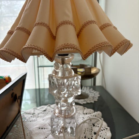 2 gamle glas lamper med ny ledning og fatning. Højde med skærm 31 cm og uden , 14 cm til fatning. Skærmene er fra Ikea , lys beige , creme farvet.