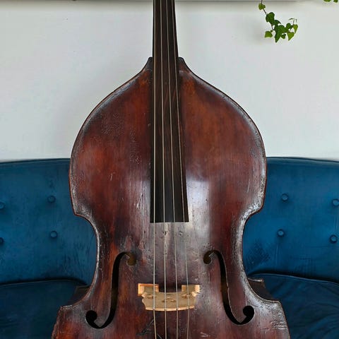 Tysk kontrabas/rejsebas (1840), Gammel tysk bas fra 1840. D-mensur. 5/8 krop. Ombygget så halsen kan tages af, hvilket gør den nemmere at rejse med. Dyb klang.