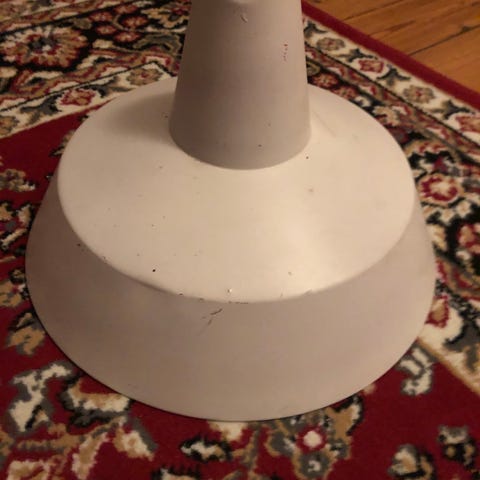 Lampeskærmen er i pæn stand med små brugsspor, fx småbitte hvide nister) samt mindre afslag i emaljen i kanten.