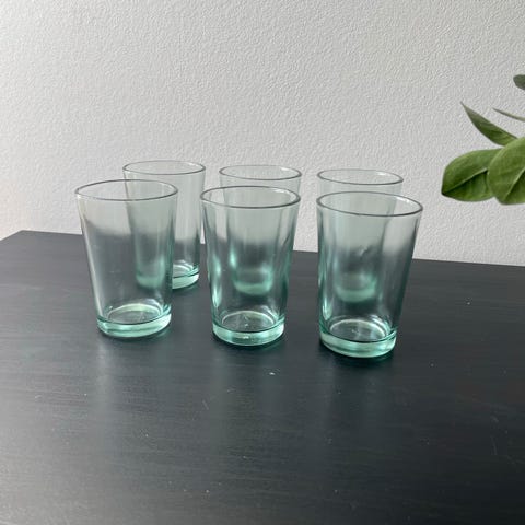 Glas, 5 drinkglas, 5 spændende drinkglas (kan dog også bruges til vand)) De er fremstillet i 1970'erne. Glassene er laver af grønt glas og er I perfekt stand uden skader. De er 7 cm høje og har en diameter på 6,5 cm ved åbningen. De sælges kun samlet. Derfor er prisen for alle 5. Står på Mols men kan gratis leveres I Aarhus og Ebeltoft eller sendes billigt på købers regning