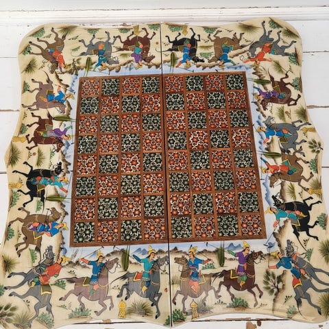 Den ene side er skak anden side er Backgammon en håndarbejde der har Taget lang lang tid for personen laver den findeste materialer kan sendes ved betaling af porto.