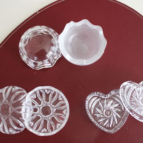 Glas skrin, 2 stk, Målene er; ø13 cm/h6 cm - ø17,5 cm/h8 cm. Prisen er for begge. Se også gerne mine andre annoncer.