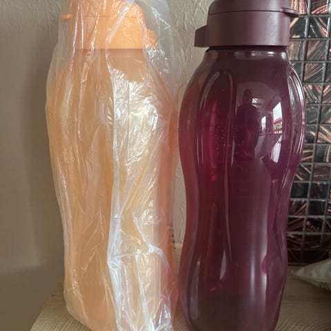 Drikkedunk, Tupperware, 1 liters. Turkis blå er væk. Kun gule, orange og bordeaux tilbage.