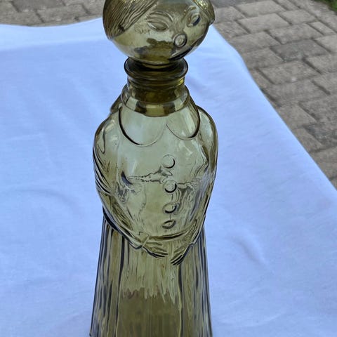 Karaffel, Fajance, 120 år gl., Karaffel Dame med rødt næb og paraply.