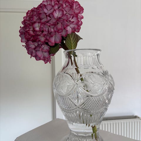 Fin vase på fod med twirl mønster i glasset. Glasset er matteret. Smuk til forårets løg i vindueskarmen.