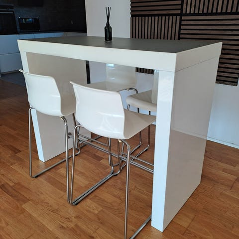 Specialfremstillet væghængt bord hvid højtrykslaminat med sort afrundet kant ,mål 135x70 .højde 94 .købt hos Ingvard Christensen,Esbjerg. OBS kun bordet er til salg