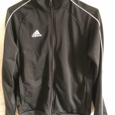 Flot træningsjakke fra Adidas sælges . Den er brugt men stadig i fin stand . Den er i str 128 . Den sælges for 40kr