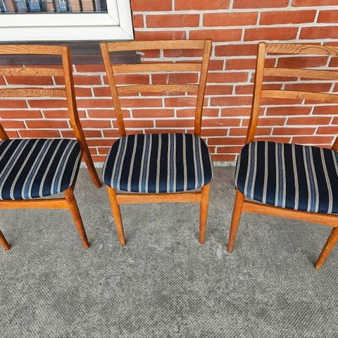 Retro spisebordsstole i eg med periodespecifikke uldbetræk og metalnitter. Flotte, skulpturelle stole, ligner Henning Kjærnulf fra 60'erne. Stolene er gode at sidde på, og i god vintage stand, men den ene stol har nogle pletter i betrækket - se billeder. Skal enten rengøres eller stolebetræk udskiftes. Pris pr stk - skal hentes. Jeg kan evt aflevere i Sønderborg-området efter aftale.