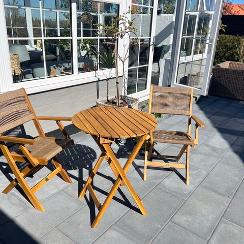 Fint lille café-sæt til haven med rundt klapbord og to stole i træ. Stolene har armlæn og flettet sæde/ryg, og bordet kan klappes sammen så det er nemt at stille væk.