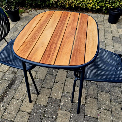 Havecafé-sæt med rundt klapbord og 2 stole i træ