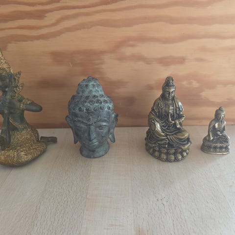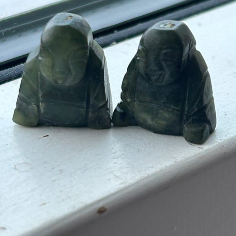 2 styk siddende buddaer?. Mål & vægt hver, cirka: H= 8 cm. Vægt: 0,165 Kg. Materiale: Stenmasse.