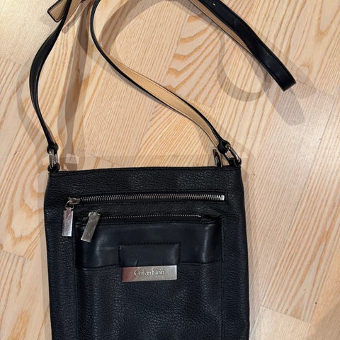 Lille taske i præget sort skind. Mål 20 x 13 cm. Stiklomme på bagsiden. Indvendigt 2 stik lommer, den ene med lommer til 6 kort.
