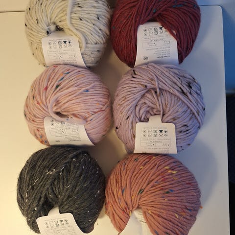 250 gr/85 m pr nøgle. 2 af hver farve. Perfekt til kurve, tasker og lignende.